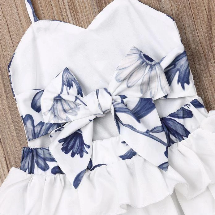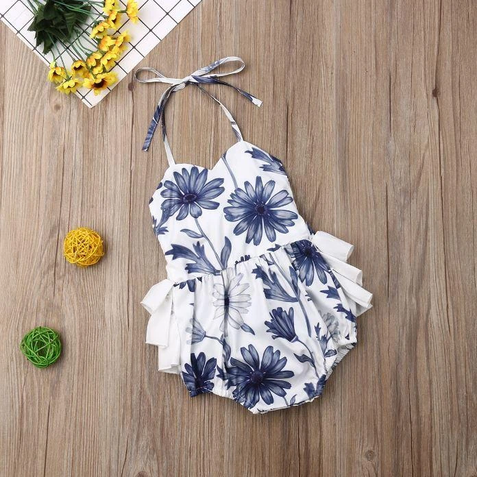 This is an adorable sleeveless blue flower ruffle backless romper for baby and toddler girls who need a sweet, stylish outfit for warm weather. Made from a soft cotton blend, it features a charming floral pattern with delicate ruffles and a trendy backless design. The button closure makes dressing easy for parents. It solves the challenge of finding a unique, one-piece outfit that’s both fashionable enough for special occasions and comfortable enough for everyday play.