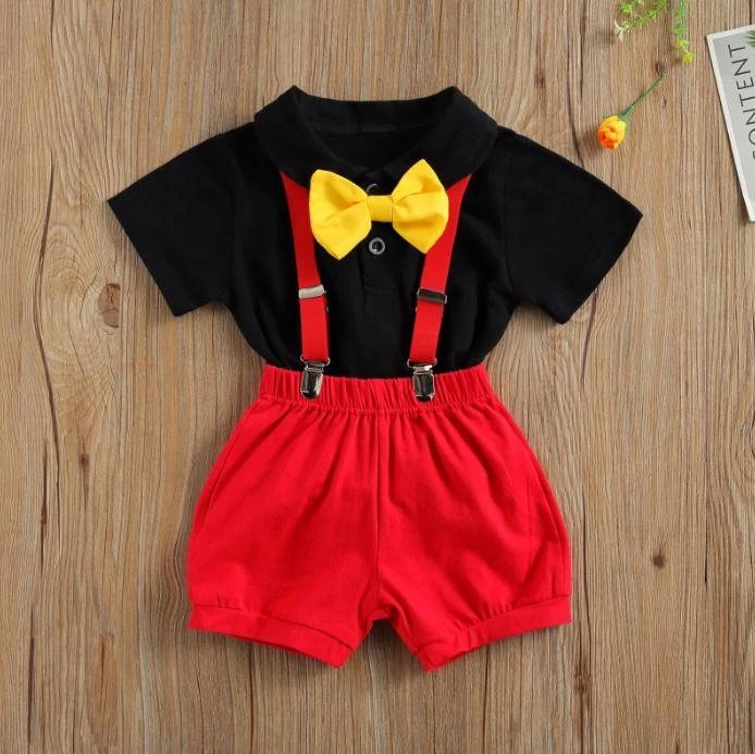 Style: Bow tie onesie with suspender shorts (2-piece gentleman outfit)