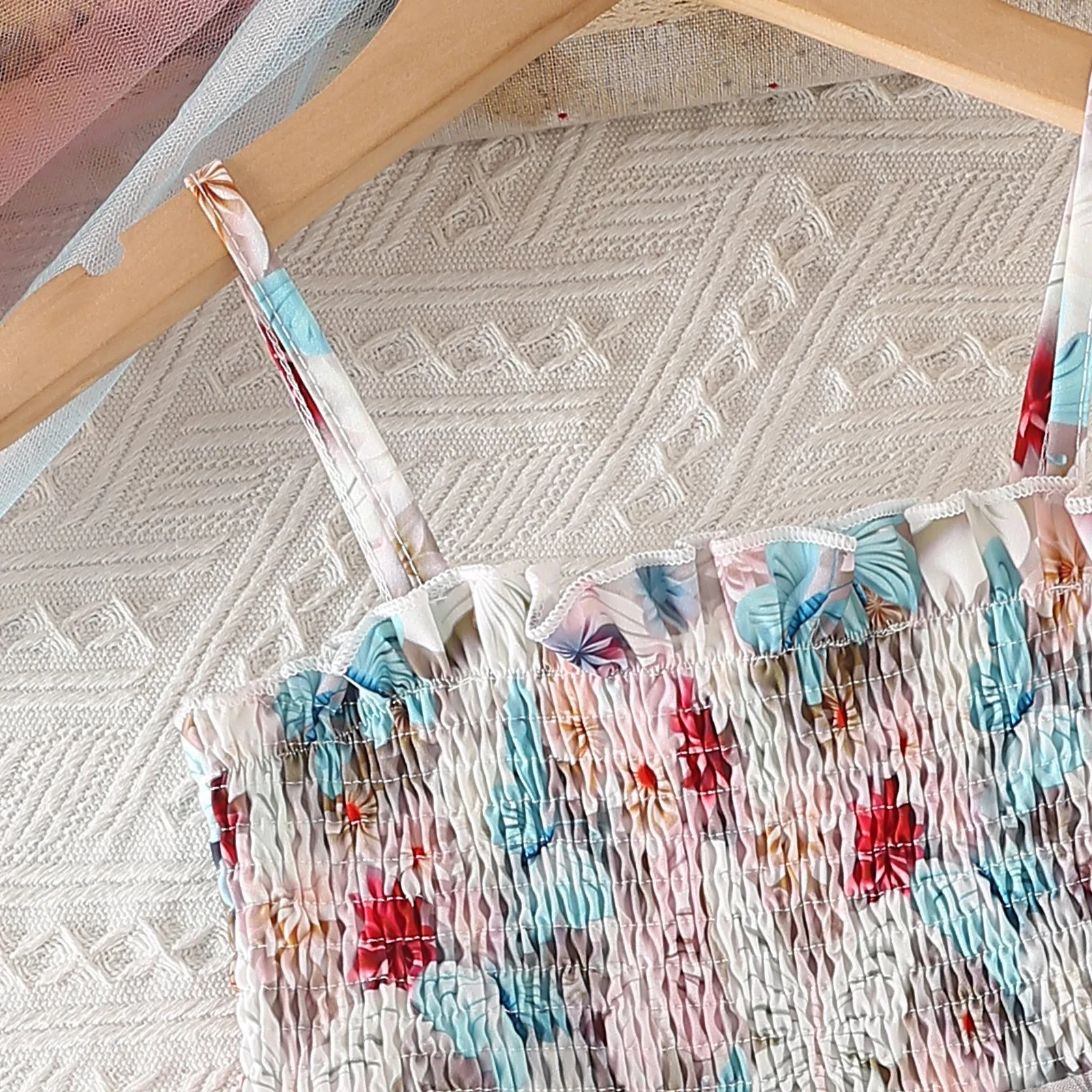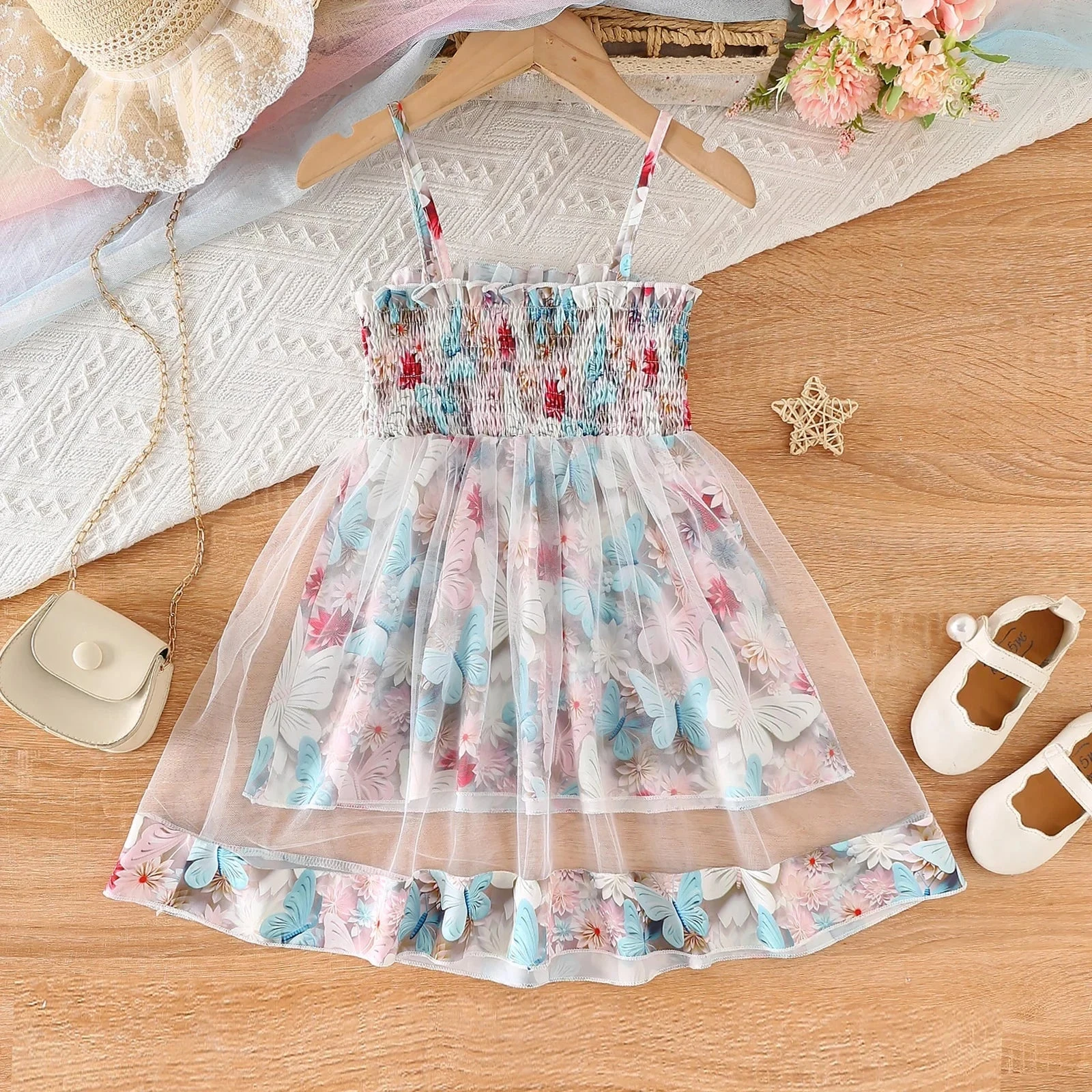This is a sleeveless butterfly floral print mesh dress for baby and toddler girls who love whimsical, nature-inspired style. Made from soft polyester, it features a beautiful combination of delicate butterflies and florals with dreamy mesh layers that add texture and movement. Perfect for spring and summer days, it solves the challenge of finding a dress that’s both playful enough for everyday adventures and pretty enough for special occasions.