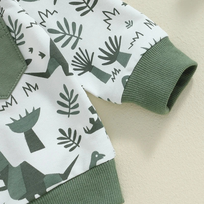 Style: Long-sleeve dinosaur print pocket top with matching pants (2-piece outfit set)