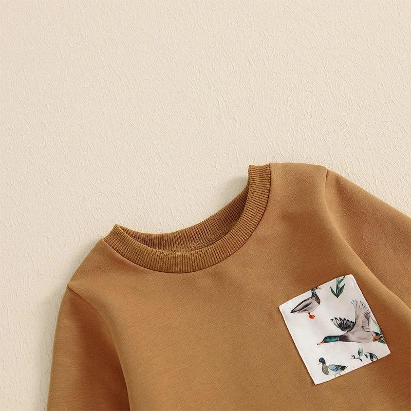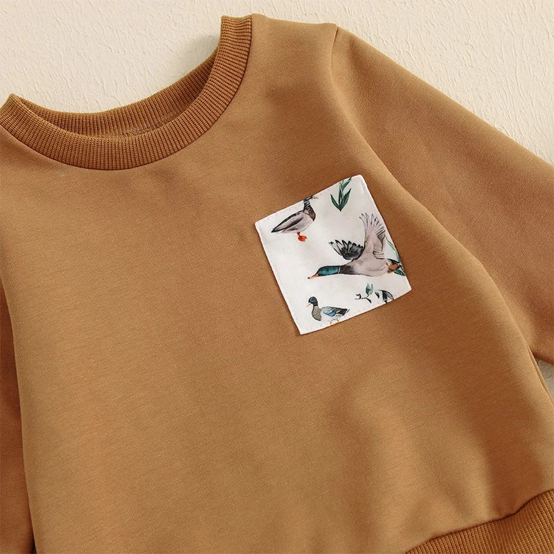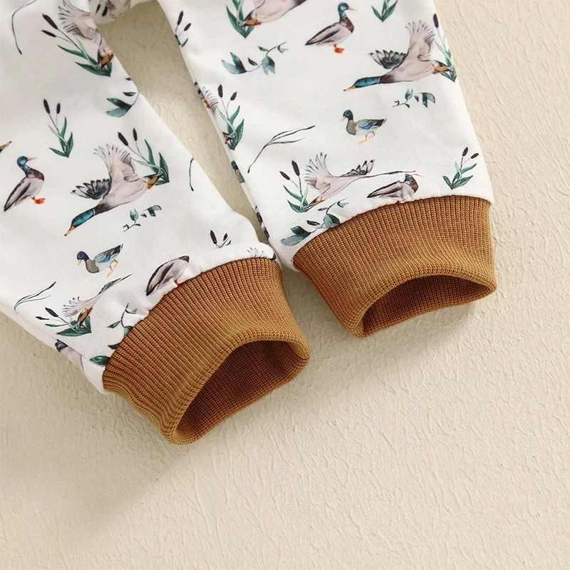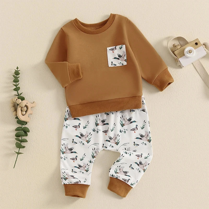 Complete 2-piece set – Includes matching pocket sweater and duck print pants for effortless coordination.