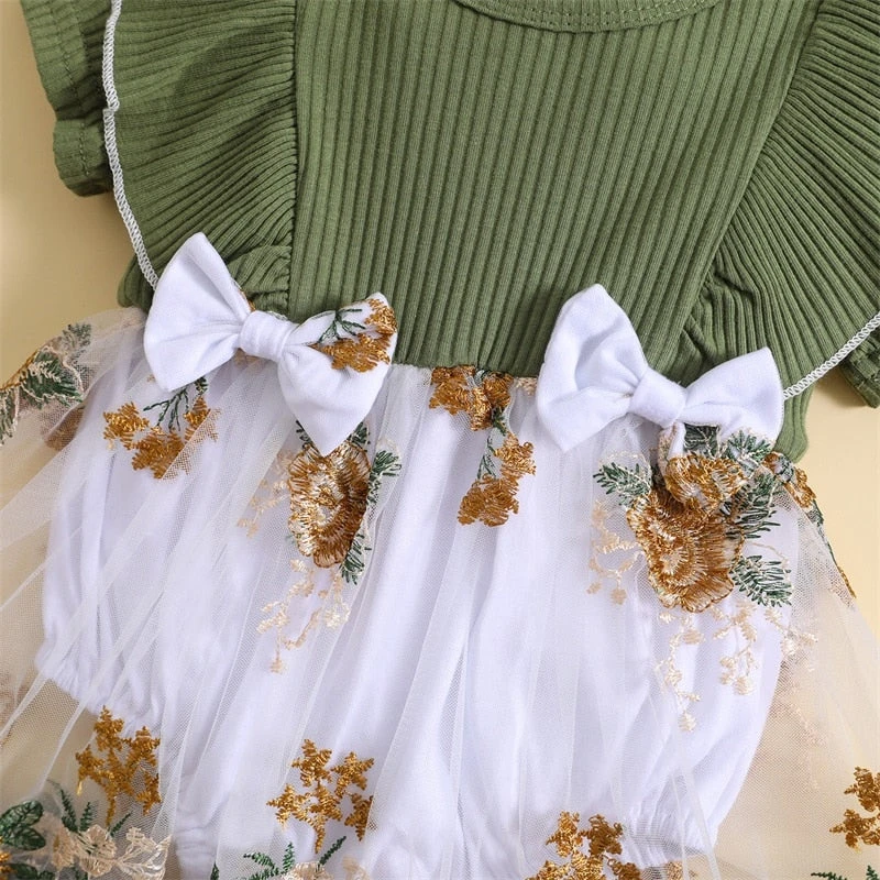 This is a short sleeve ruffled floral embroidered bow dress with a matching headband for baby and toddler girls who love sweet, feminine style. Made from a soft cotton blend, it features delicate floral embroidery, charming ruffles, and an adorable bow detail. The coordinating headband completes the look, making it perfect for special occasions or any day your little one deserves to feel extra pretty. It solves the challenge of finding a coordinated outfit that’s both elegant enough for photos and comfortable enough for all-day wear.