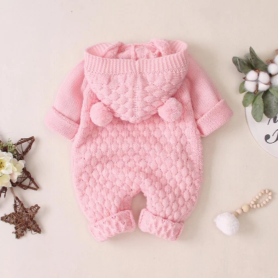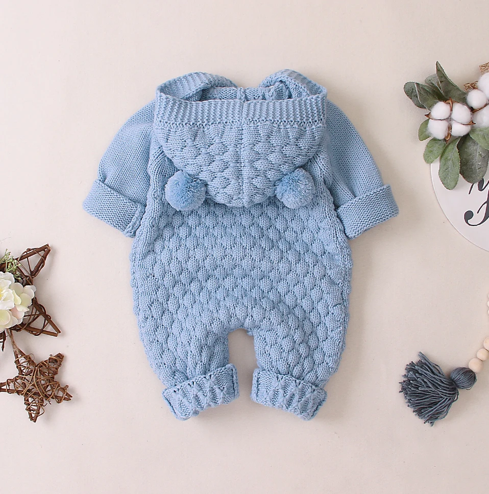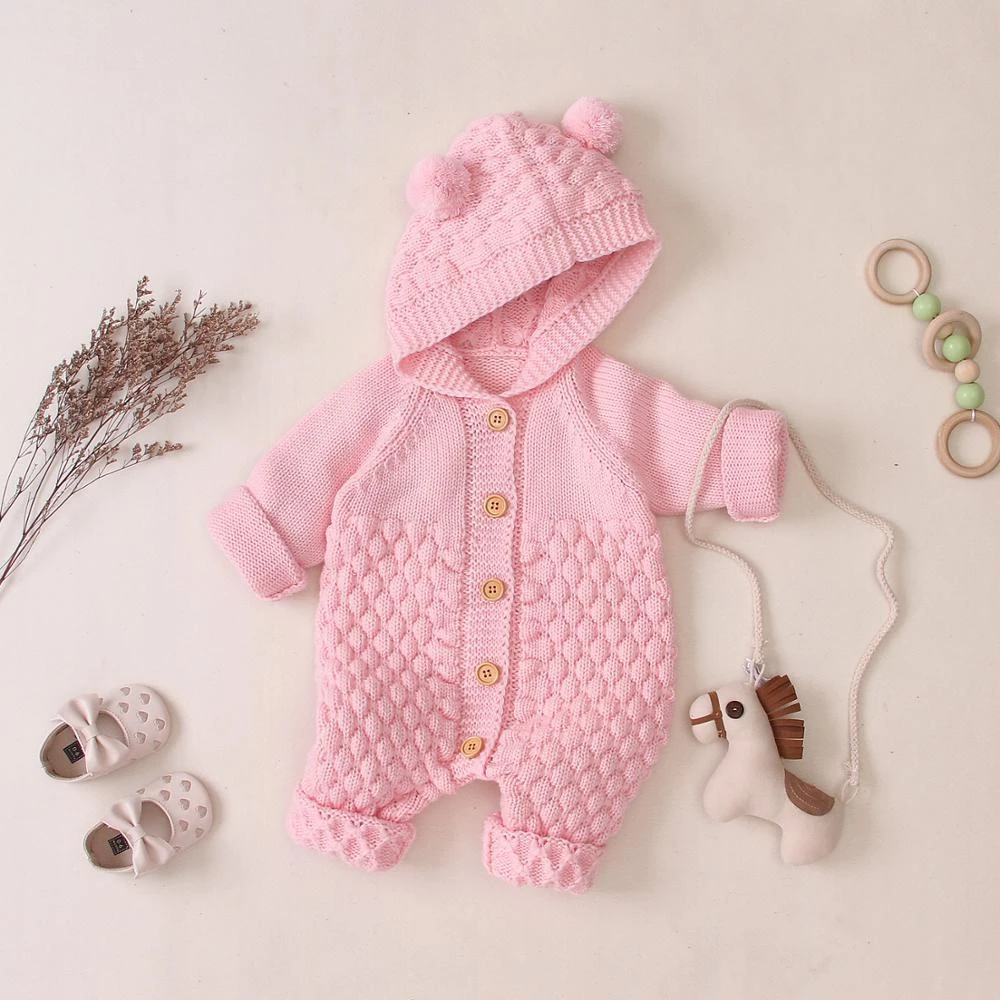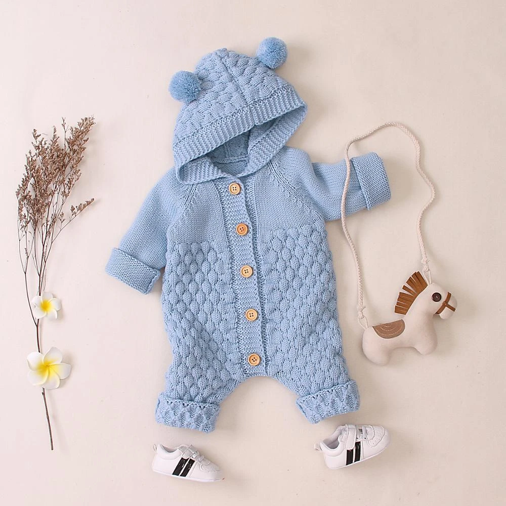 Style: Long sleeve hooded knitted pom pom button-up crochet romper jumpsuit