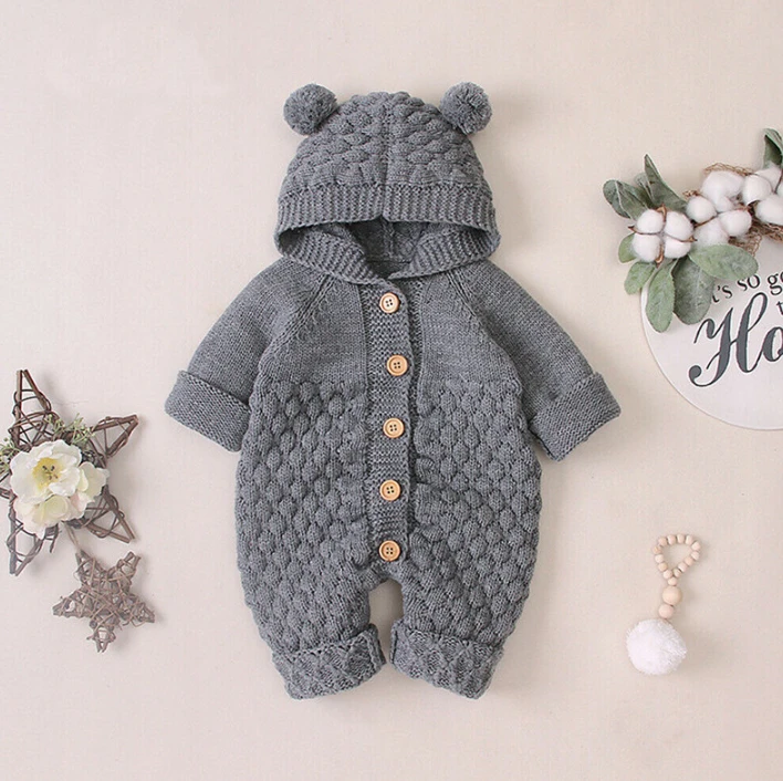 These are adorable knitted rompers for newborn infants and toddlers that are perfect for keeping little ones cozy and stylish during fall and winter. Made from a soft cotton blend, they feature long sleeves, a hooded collar, and charming pom pom details. The unique crochet-inspired knit and button-up design add a handmade touch. Available in sizes from newborn through toddler, they solve the challenge of finding warm, unique winter clothing that’s both practical for everyday wear and cute enough for special moments.
