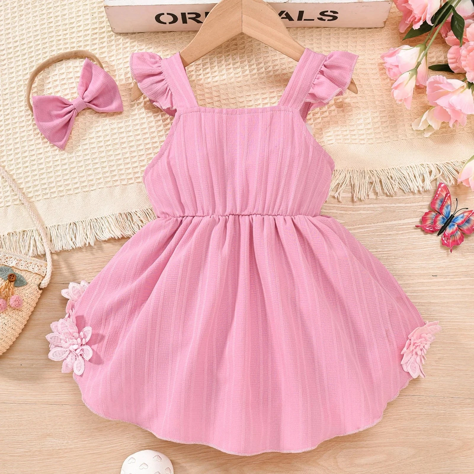 This is a 2-piece set for baby and toddler girls featuring a sleeveless pink flower bow dress with a matching headband. Made from a soft polyester blend, it combines sweet floral details with an adorable bow accent in a lovely pink hue. The coordinating headband completes the look, making it perfect for spring and summer occasions. It solves the challenge of finding a coordinated outfit that’s both feminine enough for special events and comfortable enough for all-day wear.
