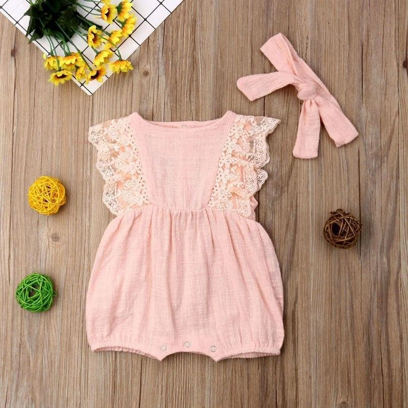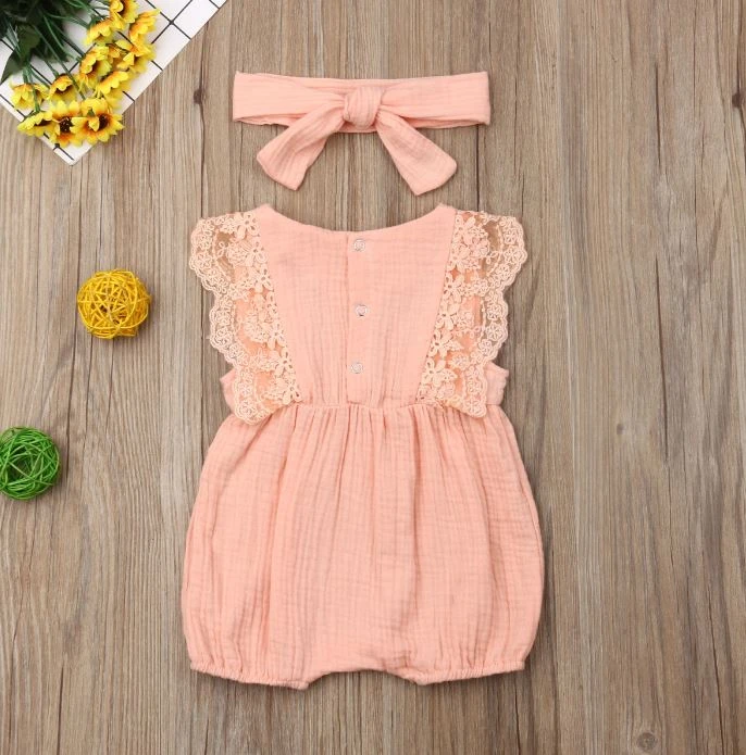 This is an adorable sleeveless pink lace romper for baby girls that comes with a matching bow to complete the sweet look. Made from soft cotton, it features delicate lace details on a classic solid pink base. The coordinating bow adds the perfect finishing touch, making it an ideal outfit for any special occasion or everyday sweetness. It solves the challenge of finding a complete, coordinated outfit that’s both precious enough for photos and comfortable enough for all-day wear.