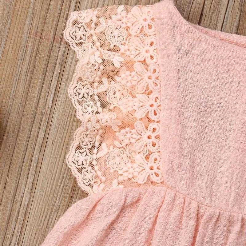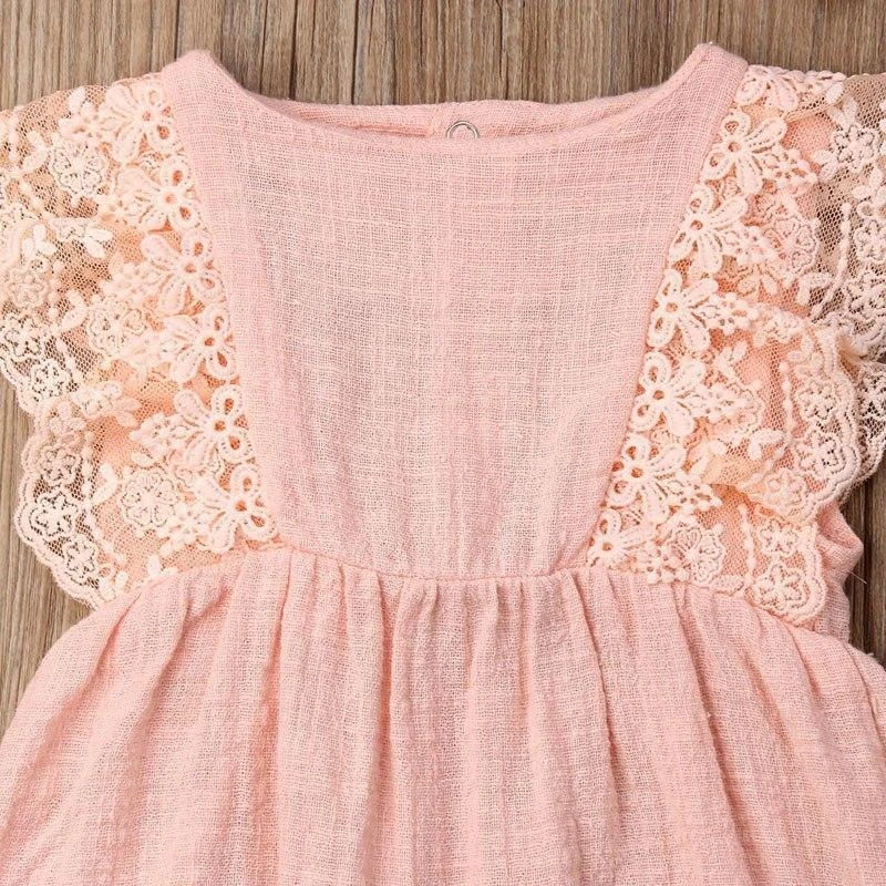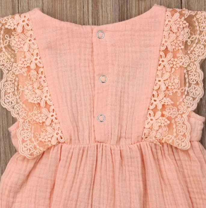 Style: Sleeveless pink lace romper with matching bow