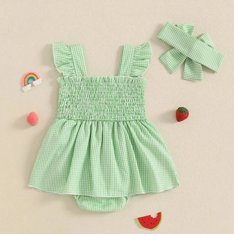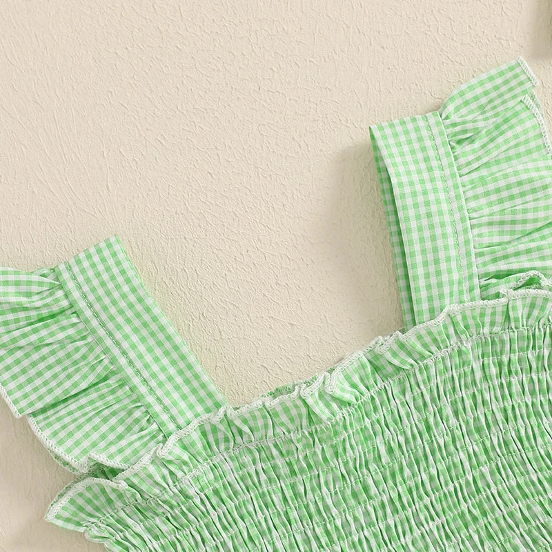 Style: Sleeveless ruffle plaid avocado print dress with matching bow (2-piece set)