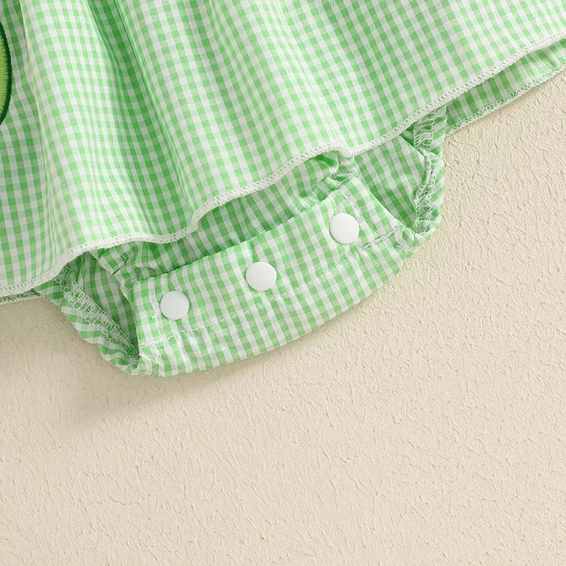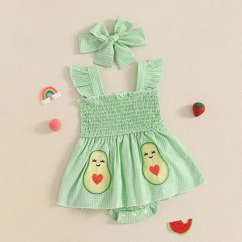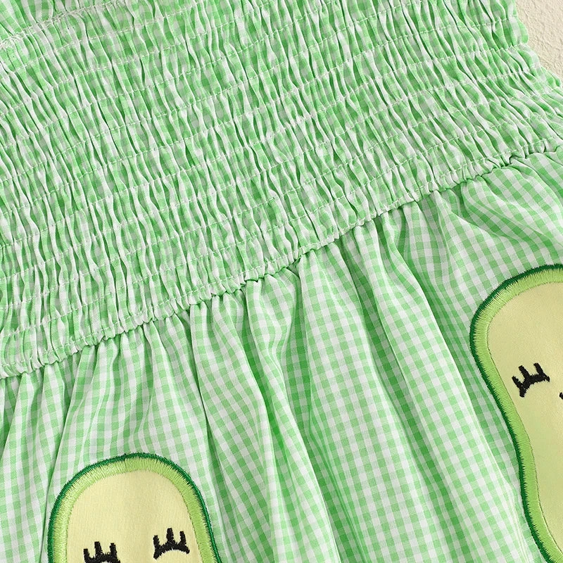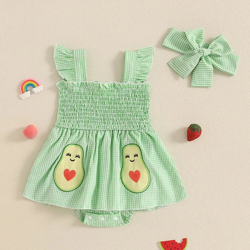 This is a 2-piece set for baby and toddler girls featuring a sleeveless ruffle plaid avocado print dress with a matching bow. Made from soft polyester, it combines classic plaid with adorable avocado accents and sweet ruffles for a playful, unique look. The coordinating bow completes the outfit perfectly. It solves the challenge of finding a coordinated set that’s both whimsical enough for everyday fun and put-together enough for special occasions.