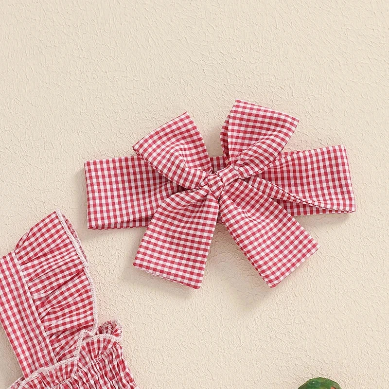 Style: Sleeveless ruffle plaid strawberry print dress with matching bow (2-piece set)