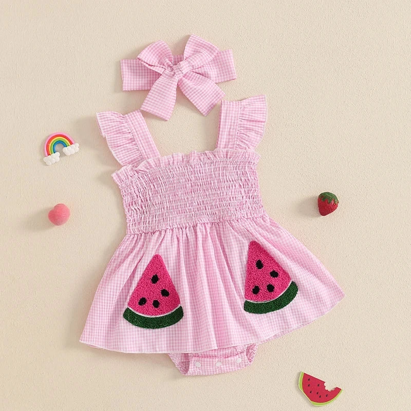 This is a 2-piece set for baby and toddler girls featuring a sleeveless ruffle plaid watermelon print dress with a matching bow. Made from soft polyester, it combines classic plaid with adorable watermelon accents and sweet ruffles for a playful, fruit-inspired look perfect for summer. The coordinating bow completes the outfit effortlessly. It solves the challenge of finding a coordinated set that’s both whimsical enough for warm-weather fun and put-together enough for special occasions.