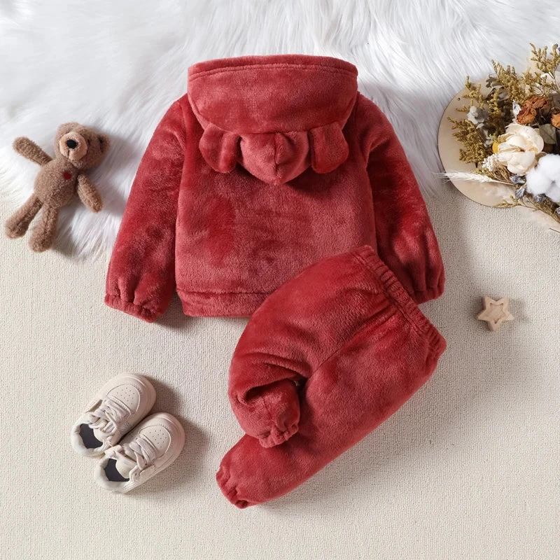 Style: Long-sleeve warm plush zip-up bear hoodie with matching pants (2-piece winter outfit)