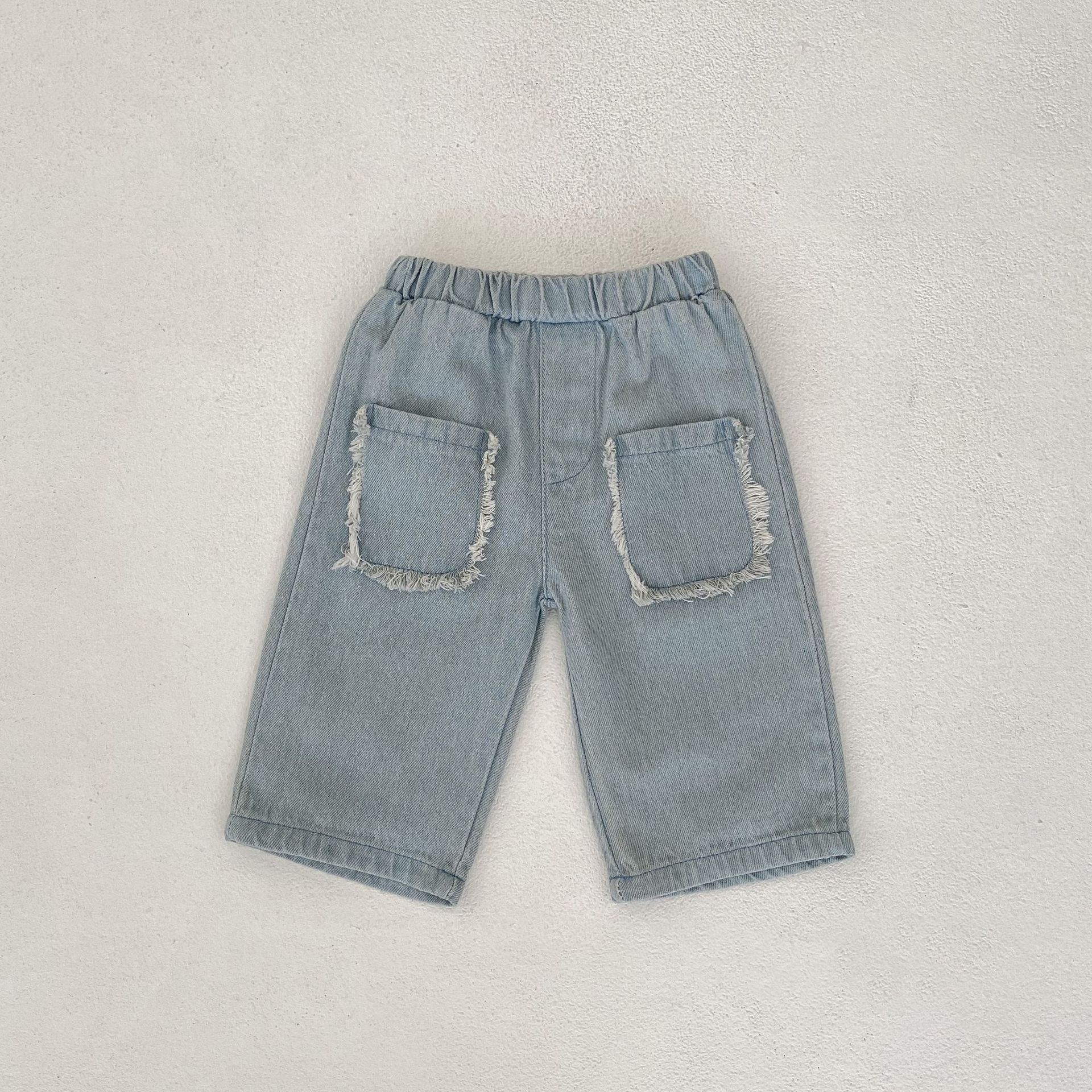 These are pocket cotton denim capri pants for babies and toddlers who need comfortable, stylish bottoms for warm weather. Made from soft cotton denim in a classic blue wash, they feature convenient pockets and a hairband belt closure for easy dressing. Available in sizes from 66cm to 100cm, they solve the challenge of finding denim pants that are both trendy enough for everyday style and practical enough for active little ones.