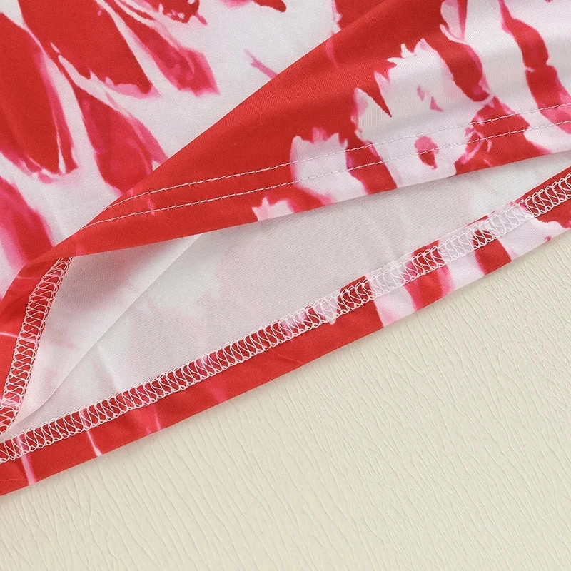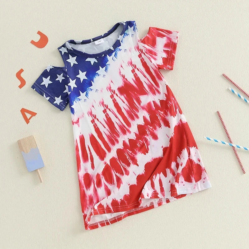 This is a short sleeve shoulder cut-out tie-dye stars dress for toddler girls who love to celebrate patriotic holidays in style. Made from a soft polyester and spandex blend, it features a fun tie-dye pattern with star accents and trendy shoulder cut-outs. Perfect for 4th of July, Memorial Day, or any patriotic celebration, it solves the challenge of finding festive attire that’s both comfortable enough for all-day wear and stylish enough to make your little one stand out at parades and parties.